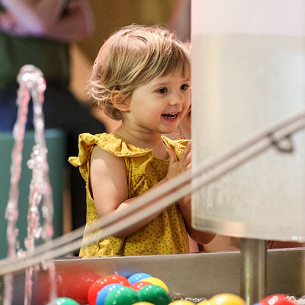 Na zdjęciu widać małą, uśmiechniętą dziewczynkę w żółtej sukience przy eksponacie wodnym na wystawie Bzzz! w Koperniku.