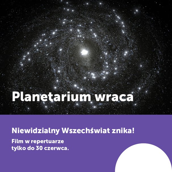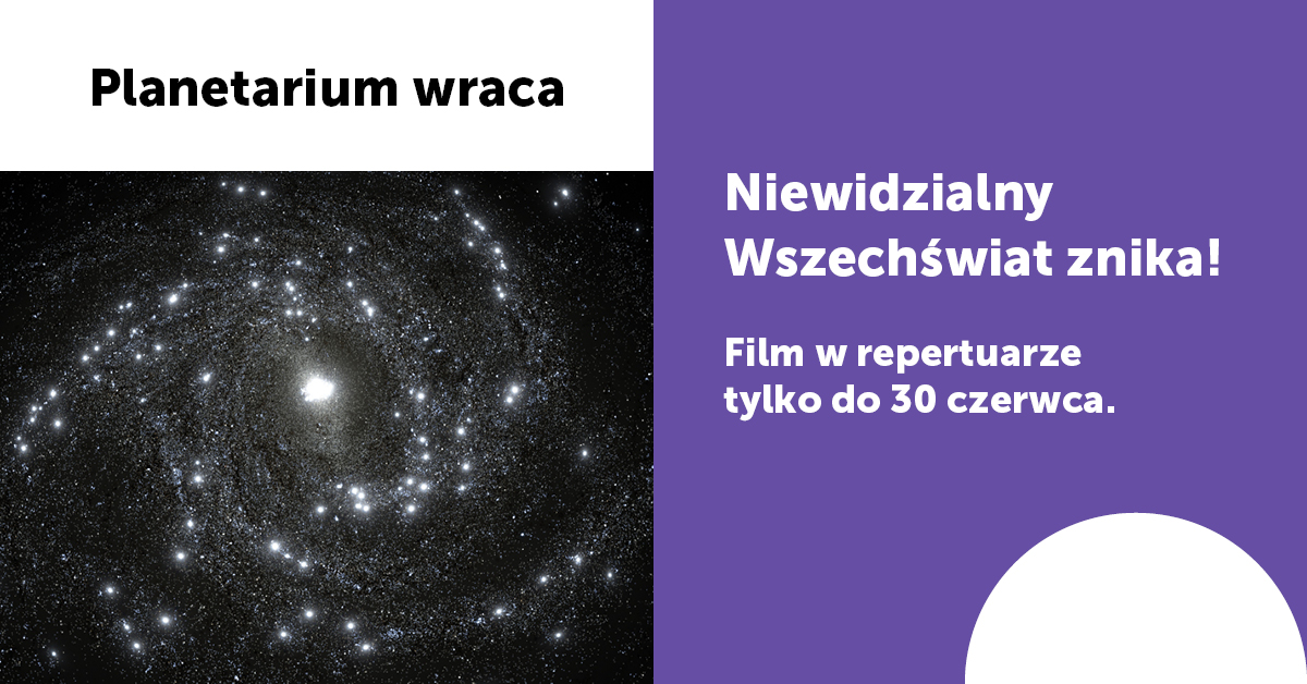 Czegoś nie widać i nie czuć, a jednak istnieje. Czy to możliwe? Planetarium wraca po przerwie, otwieramy się już 21 maja. W idealnym momencie, byście mieli jeszcze okazję zobaczyć nasz kultowy film - Niewidzialny Wszechświat. Jest on w repertuarze tylko do 30 czerwca. To ostatnia szansa, by go obejrzeć i spróbować rozwiązać zagadkę ciemnej materii. Niewidocznej i niewyczuwalnej, a jednak wraz z ciemną energią stanowiącej aż 95% kosmosu.
