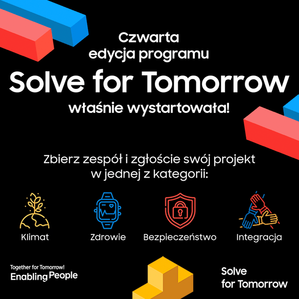 Solve for Tomorrow to globalny program edukacyjny dla uczniów szkół średnich, prowadzony przez Samsung w wielu krajach na świecie. Od 2021 roku działa także w Polsce. Inicjatywa wspiera rozwój kompetencji przyszłości – tzw. 4K: kreatywności, komunikacji, kooperacji oraz krytycznego myślenia. Uczestnicy programu projektują rozwiązania będące odpowiedzią na aktualne potrzeby współczesnego świata w jednym z czterech obszarów: klimat, zdrowie, bezpieczeństwo i integracja. Ich pomysły uwzględniają problemy lokalnych społeczności będące jednocześnie globalnymi wyzwaniami. Nabór uczestników potrwa do 30 listopada 2024.