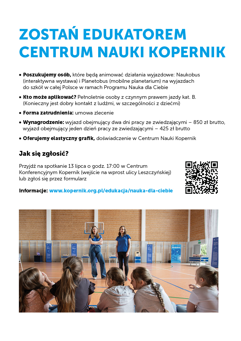Centrum Nauki Kopernik szuka edukatorów do programu Nauka dla Ciebie. Masz prawo jazdy, lubisz pracę z ludźmi – szczególnie z dziećmi – a nauka jest dla Ciebie fascynująca? Poznajmy się.