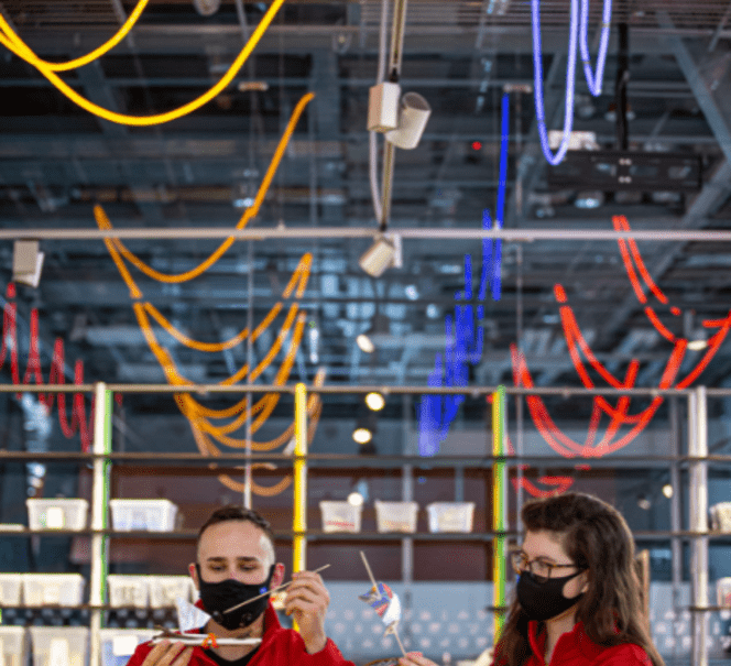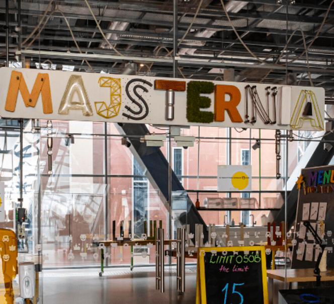 Відкриваємо скляні двері, що ведуть від гамірних виставок Коперника, і потрапляємо до спокійного простору майстерні. Бачимо великі столи, які можна розділити і влаштувати більш камерні умови для праці. Перед нами меню, повне експериментів. Саме час вибрати завдання. Спробуємо побудувати літаючу конструкцію. На столі з’являються палички, гумки, ножиці і клаптики паперу. Можемо починати! Не маємо чітких інструкцій і рішень, але у нас є час. Все виключно в наших руках. Результат залежить від нашої винахідливості, вправності та наполегливості.